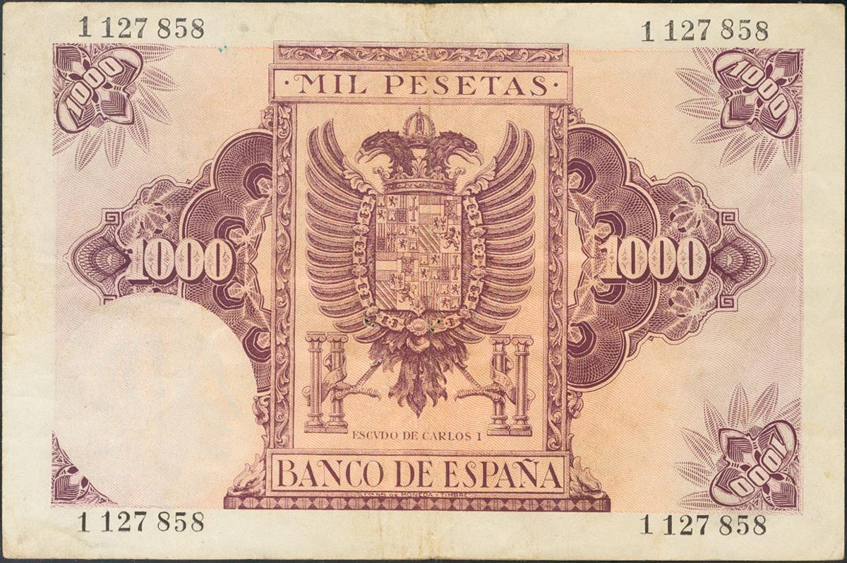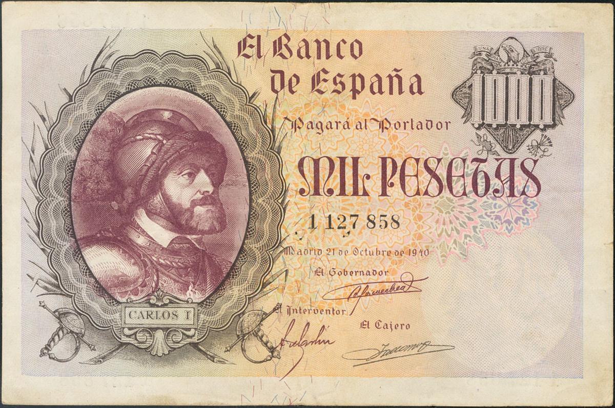 1000 Pesetas. 21 de Octubre de 1940. Sin serie. (Edifil 2017: 445). Marquitas de grapa y apresto original. MBC-.