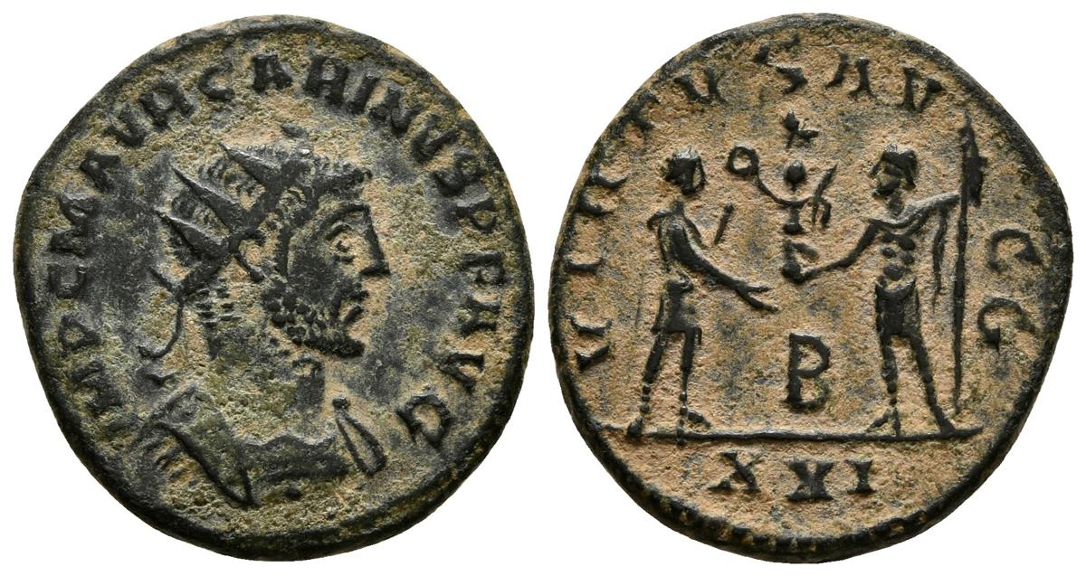 CARINO. Antoniniano. 282-283 d.C. Trípolis. A/ Busto radiado y con coraza a derecha. IMP C M AVR CARINVS NOB C. R/ Emperador en pie a derecha sosteniendo Parazonium y recibiendo Victoria sobre globo de Júpiter a izquierda, entre ellos B. VIRTVS AVGG, en exergo XXI. RIC 325. Ae. 4,13g. MBC.
