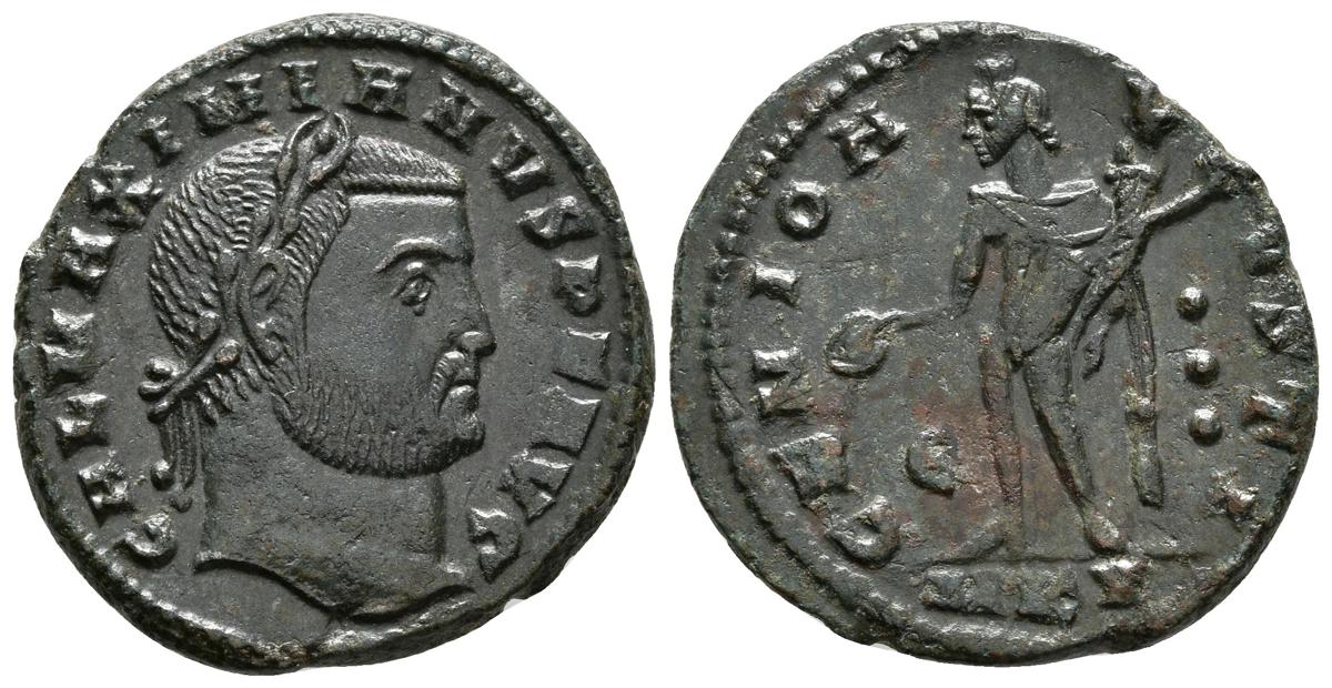 MAXIMIANO. Follis. 300 d.C. Aquileia. A/ Busto laureado a derecha. MAXIMIANVS NOB CAES. R/ Moneta estante a izquierda portando balanza y cornucopia, en el campo estrella. SACRA MONVRB AVGG ET CAESS NN, en exergo AQ. RIC VI 30var. Ae. 9,22g. Grieta. MBC+.