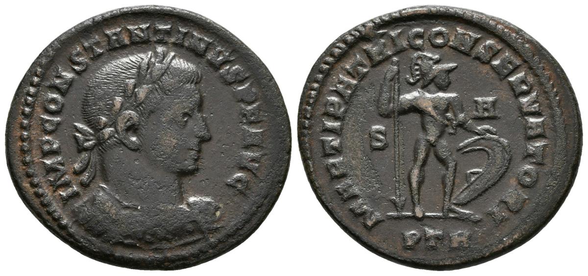 CONSTANTINO I. Follis. 307-337 d.C. Treveri. A/ Busto laureado con coraza a derecha. IMP CONSTANTINVS P F AVG. R/ Marte estante a derecha portando lanza y escudo, a ambos lados S-A. MARTI PATRI CONSERVATORI, en exergo PTR. RIC 772a. Ae. 6,63g. MBC/MBC+.
