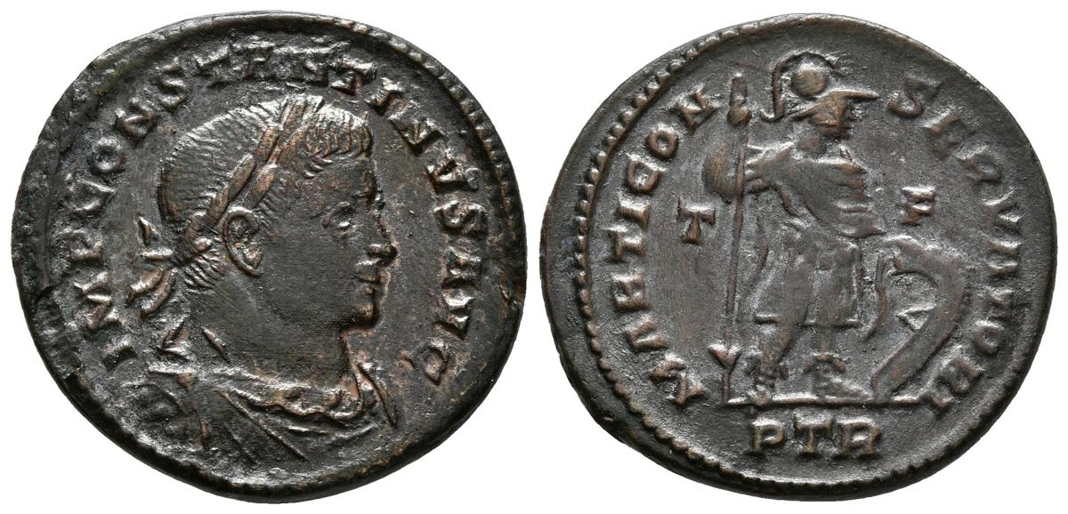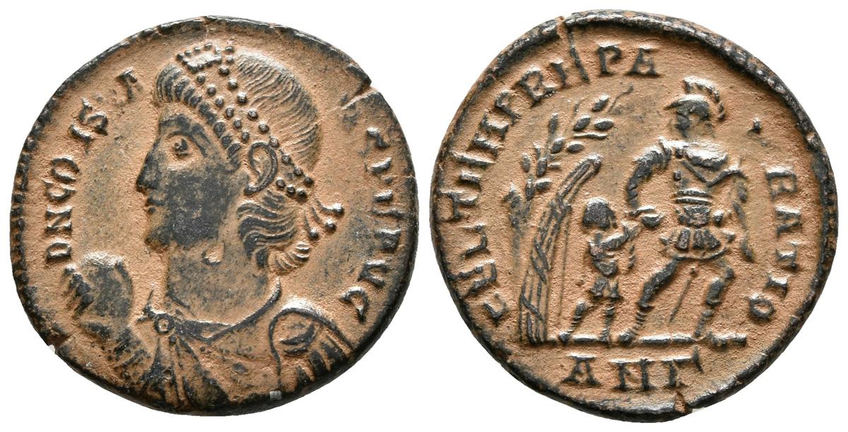 CONSTANCIO I. Maiorina. 347-348 d.C. Antioquía. A/ Busto con diadema de perlas con drapeado y coraza a izquierda, en la mano derecha globo. D N CONSTANS P F AVG. R/ Soldado avanzando a derecha con la cabeza vuelta, sujetando lanza y llevando una figura pequeña desde una cabaña debajo de un árbol. FEL TEMP REPARATIO, en exergo ANr. RIC 126. Ae. 4,76g. EBC+.