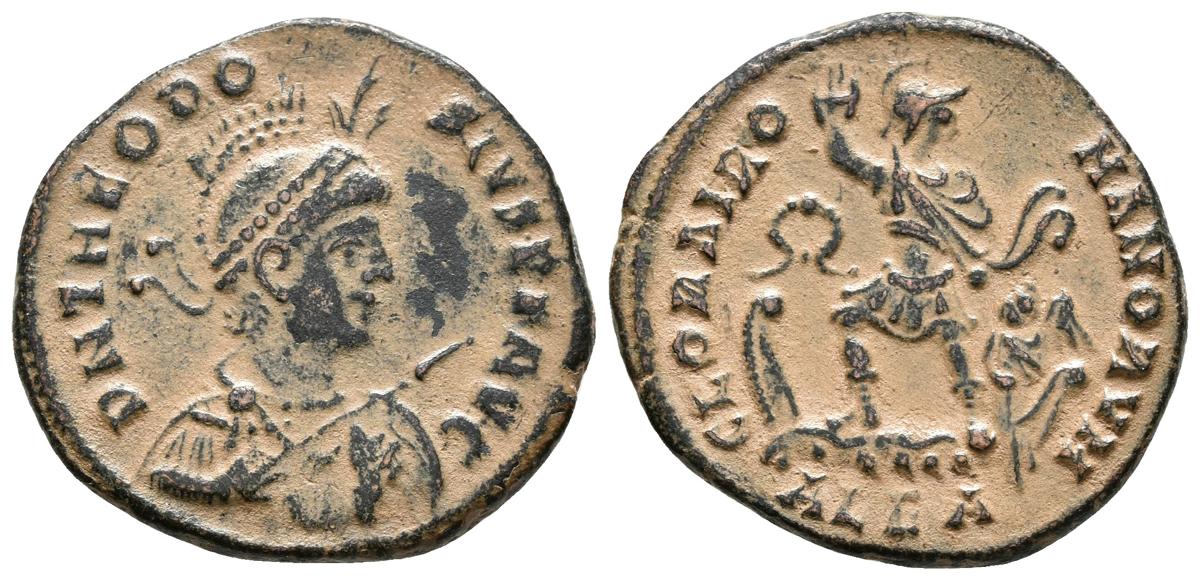 THEODOSIO I. Maiorina. 383-388 d.C. Alejandría. A/ Busto con casco, drapeado y con coraza a derecha, sosteniendo lanza y escudo. D N THEODOSIVS P F AVG. R/ Emperador en pie mirando a derecha sobre barco, levantando su mano derecha y Victoria manejando el timón, en el campo corona. GLORIA ROMANORVM, en exergo ALEA. RIC 15b. Ae. 5,73g. MBC+/EBC-.