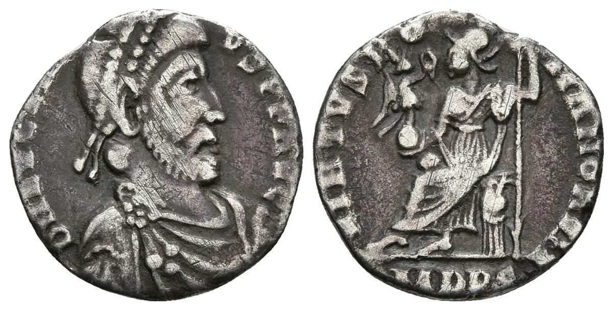 EUGENIO. Siliqua. 392-394 d.C. Mediolanum (Milán). A/ Busto con diadema de perlas y drapeado con coraza. DN EVGENIVS PF AVG. R/ Roma sedente a izquierda sosteniendo victoria sobre globo y lanza invertida. VIRTVS ROMANORVM. En exergo MDPS. RIC IX 32c. Ar. 1,35g. Rayitas en anverso. MBC. Escasa.