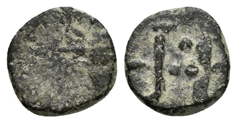 VISIGODOS. Nummus. Siglo VI. Emérita (Mérida). A/ Busto a derecha. R/ Monograma formado por una M con lazos en las puntas y punto en el interior. Crusafont No cita. Ae. 0,48g. Acuñación desplazada en anverso. MBC. Escasa.