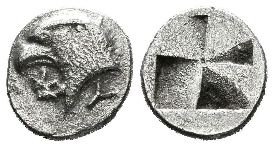 AEOLIS, Kyme. Hemióbolo. (Ar. 0,44g/8mm). 480-450 a.C. (SNG Copenhagen 32). Anv: Cabeza de águila a izquierda, entre K-Y. Rev: Cuatripartito incuso. MBC+.