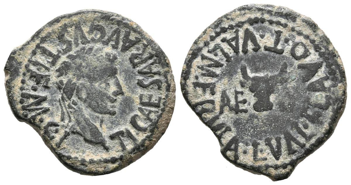 CALAGURRIS (Calahorra, La Rioja). Semis. (Ae. 4,55g/22mm). 14-36 d.C. (FAB-431). Anv: Cabeza laureada de Tiberio a derecha, alrededor leyenda: TI CAESAR AVGVST F M C I. Rev: Cabeza de toro entre: AE-D, alrededor leyenda: L VAL FLAVO T VAL MERVLA. MBC-.