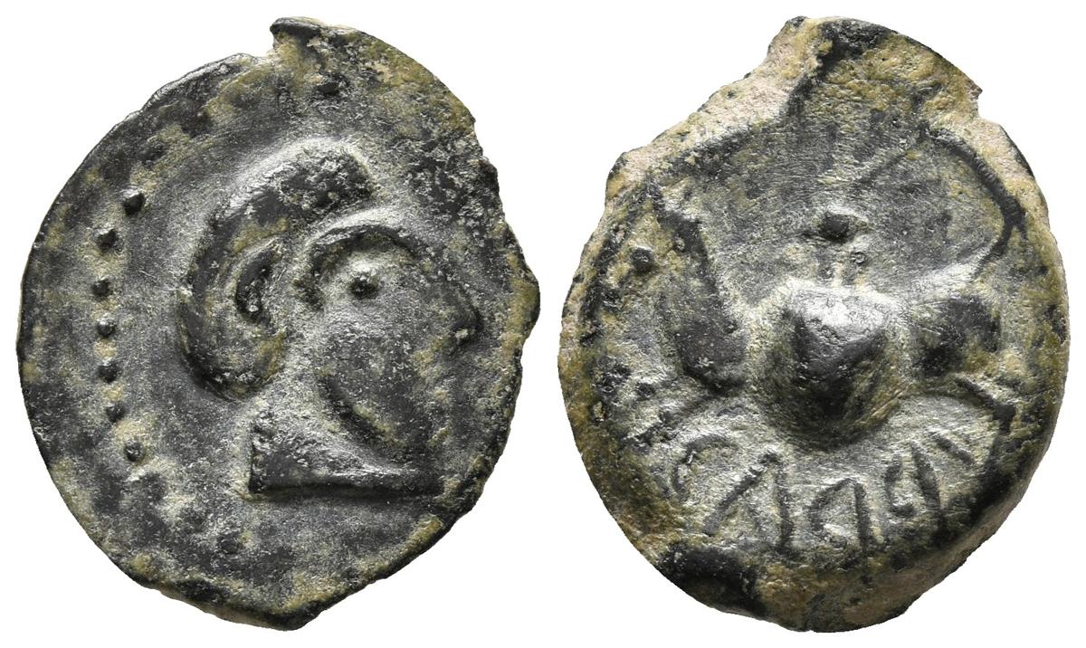 CARISA (Bornos, Cádiz). Semis. (Ae. 2,57g/19mm). 50 a.C. (FAB-449). Anv: Cabeza masculina laureada a derecha. Rev: Jinete con lanza y escudo a izquierda, debajo leyenda: CARSA (R invertida). MBC.