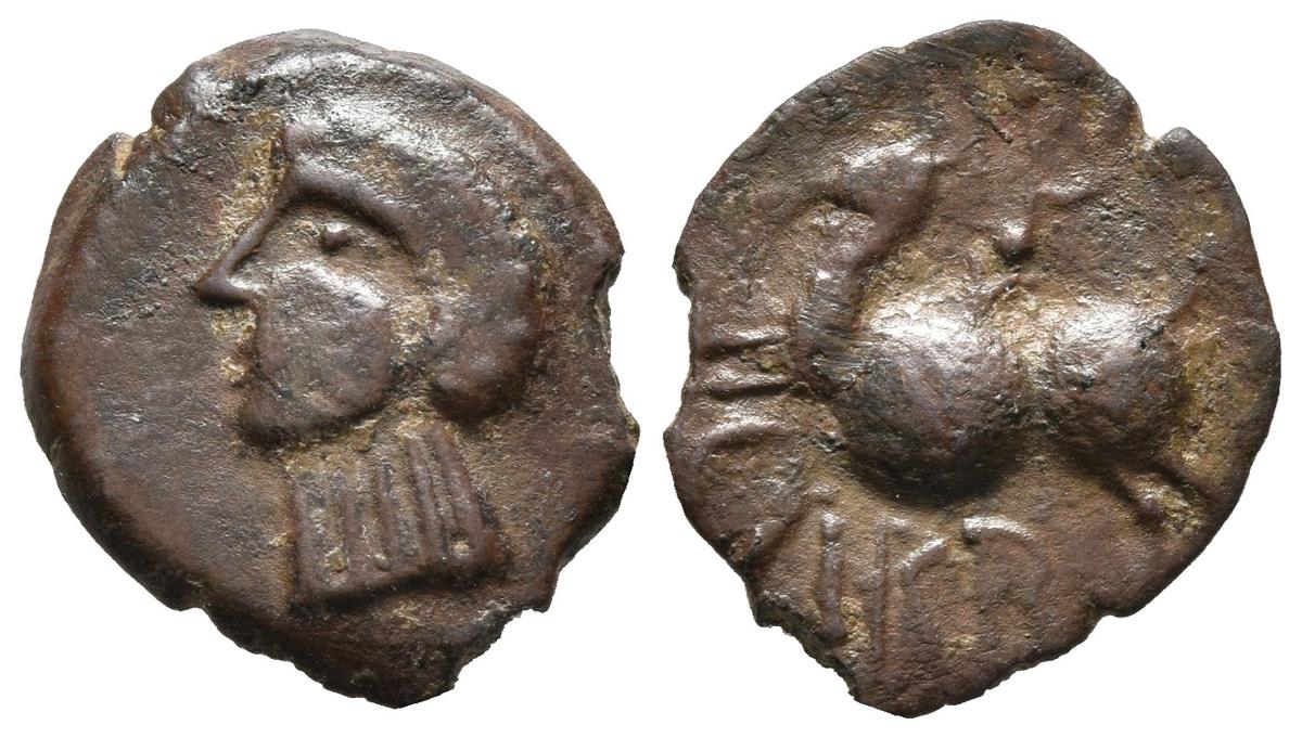 CARISA (Bornos, Cádiz). Semis. (Ae. 2,16g/17mm). 50 a.C. (FAB-453 var). Anv: Cabeza masculina a izquierda. Rev: Jinete con lanza y escudo a izquierda, debajo leyenda: CAISR. MBC. Variante rara.