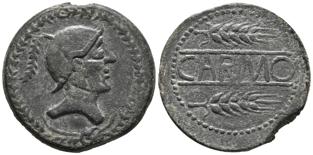 CARMO (Carmona, Sevilla). As. (Ae. 16,68g/33mm). 80 a.C. (FAB-454). Anv: Cabeza masculina con casco a derecha, dentro de láurea. Rev: Dos espigas a derecha, entre ellas leyenda: CARMO. MBC.