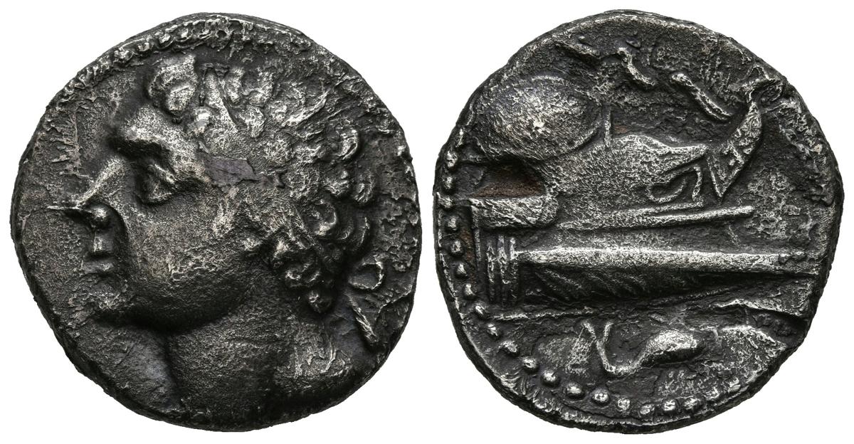 CARTAGONOVA (Cartagena, Murcia). Shekel. (Ar. 6,75g/21mm). 235-220 a.C. (FAB-482). Anv: Cabeza masculina diademada a izquierda. Rev: Proa de nave con un escudo, debajo delfín. MBC+. Muy raro.
