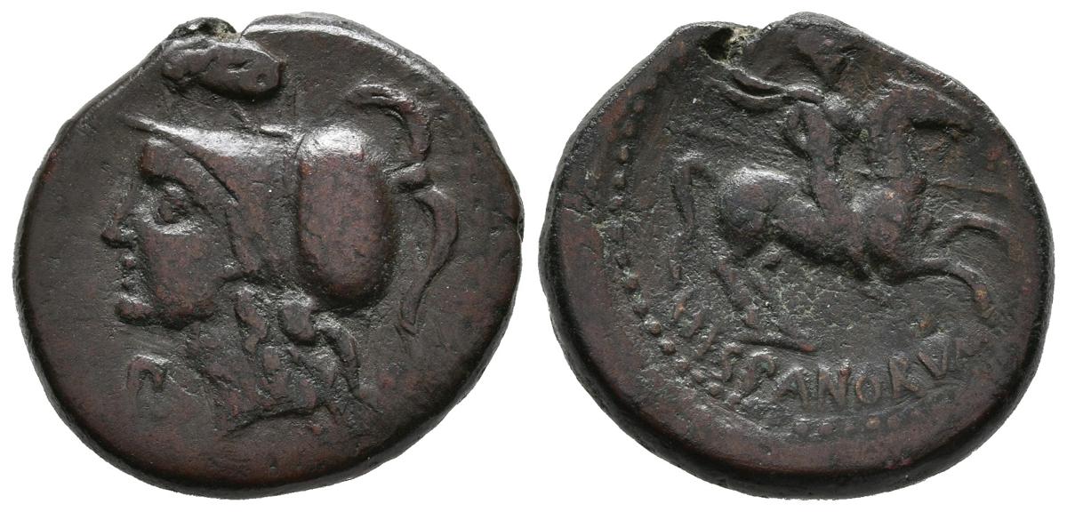 SICILIA, Morgantina. Ae20. (Ae. 6,72g/20mm). Mediados siglo II a.C. (SNG ANS 471). Anv: Cabeza de Minerva a izquierda, encima cabeza de carnero a izquierda, debajo letra P. Rev: Jinete con lanza a derecha, debajo leyenda: HISPANORVM. MBC. Raro.