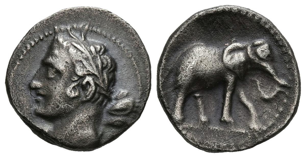 CARTAGONOVA (Cartagena, Murcia). 1/4 Shekel. (Ar. 1,74g/14mm). 235-220 a.C. (FAB-487). Anv: Cabeza de Melkart-Heracles laureada a izquierda con clava. Rev: Elefante a derecha. MBC+. Pátina. Escaso ejemplar, y más así.