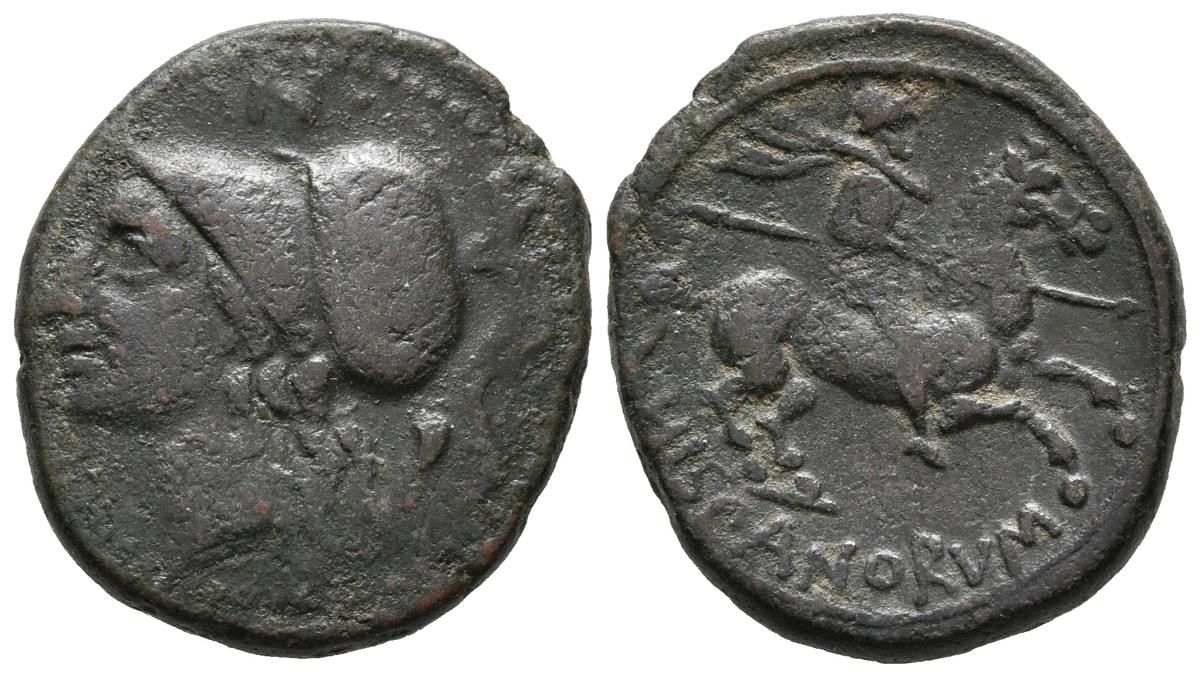 SICILIA, Morgantina. Ae20. (Ae. 6,32g/22mm). Mediados siglo II a.C. (SNG ANS 471.4). Anv: Cabeza de Minerva a izquierda, encima letra N. Rev: Jinete con lanza a derecha, debajo leyenda: HISPANORVM. MBC-/MBC. Raro.