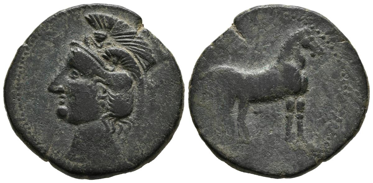 CARTAGONOVA (Cartagena, Murcia). Calco. (Ae. 9,38g/27mm). 220-215 a.C. (FAB-525). Anv: Cabeza de Atenea a izquierda. Rev: Caballo parado a derecha. MBC+/MBC.