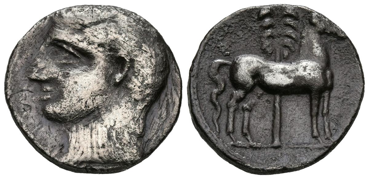 CARTAGONOVA (Cartagena, Murcia). Shekel. (Ar. 6,90g/20mm). 220-205 a.C. (FAB-547). Anv: Cabeza masculina a izquierda. Rev: Caballo parado a derecha, detrás palmera. MBC.