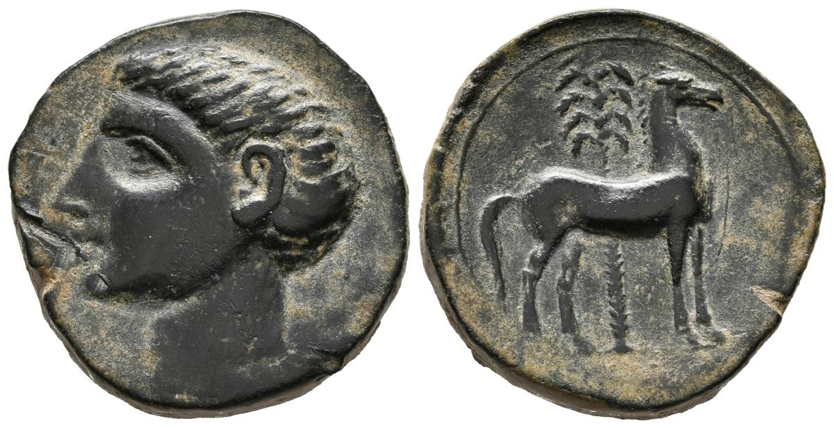 CARTAGONOVA (Cartagena, Murcia). Calco. (Ae. 11,89g/25mm). 220-205 a.C. (FAB-552). Anv: Cabeza masculina a izquierda. Rev: Caballo parado a derecha, detrás palmera. EBC-.