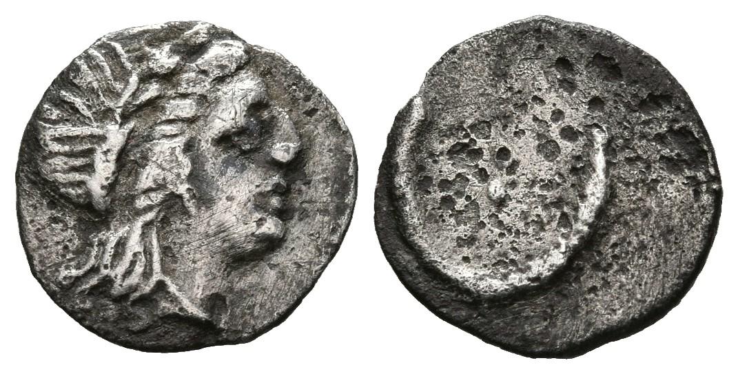CARTAGONOVA (Cartagena, Murcia). 1/12 Shekel. (Ar. 0,30g/9mm). 200-190 a.C. (FAB-563). Anv: Cabeza masculina a derecha. Rev: Creciente con punto. MBC-.