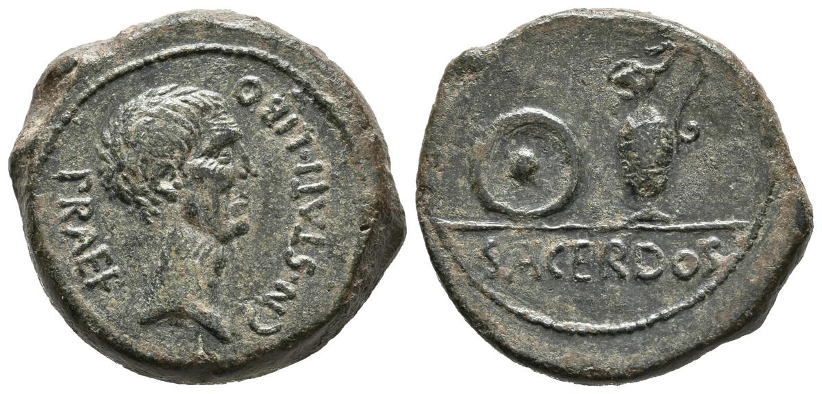 CARTAGONOVA (Cartagena, Murcia). Semis. (Ae. 9,91g/23mm). 27 a.C.-14 d.C. (FAB-587). Anv: Cabeza de Agripa a derecha, alrededor leyenda: CN STATI LIBO PRAEF. Rev: Pátera y preferículo, debajo de línea leyenda: SACERDOS. MBC+.