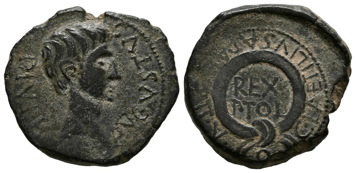 CARTAGONOVA (Cartagena, Murcia). Semis. (Ae. 5,58g/21mm). 27 a.C.-14 d.C. (FAB-590). Anv: Cabeza de Augusto a derecha, alrededor leyenda: AVGVSTVS DIVI F. Rev: Leyenda: REX PTOL dentro de láurea, alrededor leyenda: C LAETILIVS APALVS II V Q. MBC.