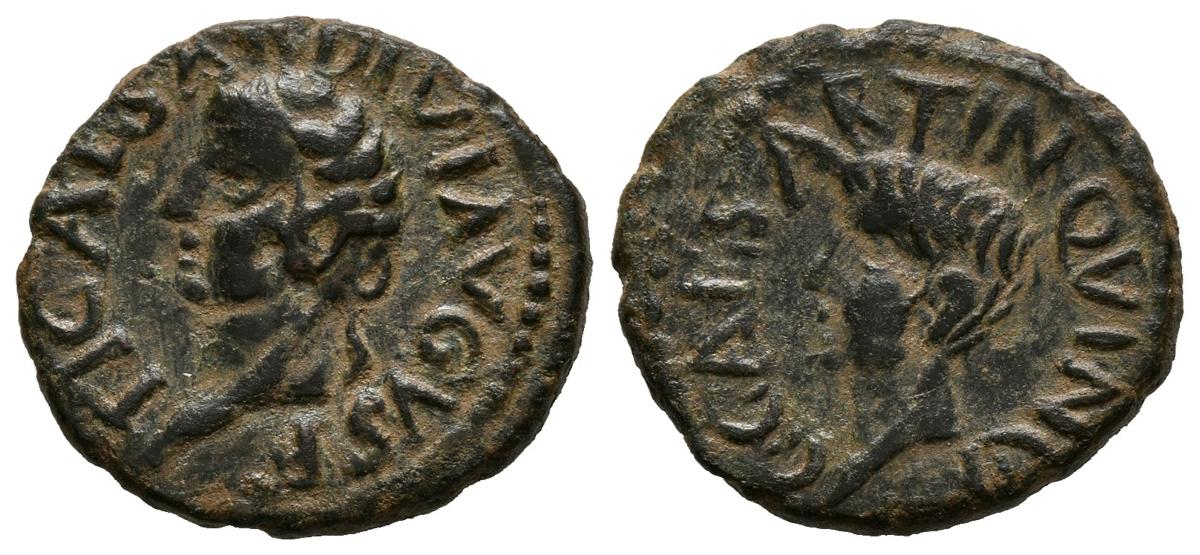 CARTAGONOVA (Cartagena, Murcia). Sextante. (Ae. 2,51g/17mm). 14-36 d.C. (FAB-610). Anv: Cabeza de Tiberio laureada a izquierda, alrededor leyenda: TI CAESAR DIVI AVGVS F. Rev: Cabeza de Calígula a izquierda, alrededor leyenda: C CAESAR TI N QVIN K. MBC+.