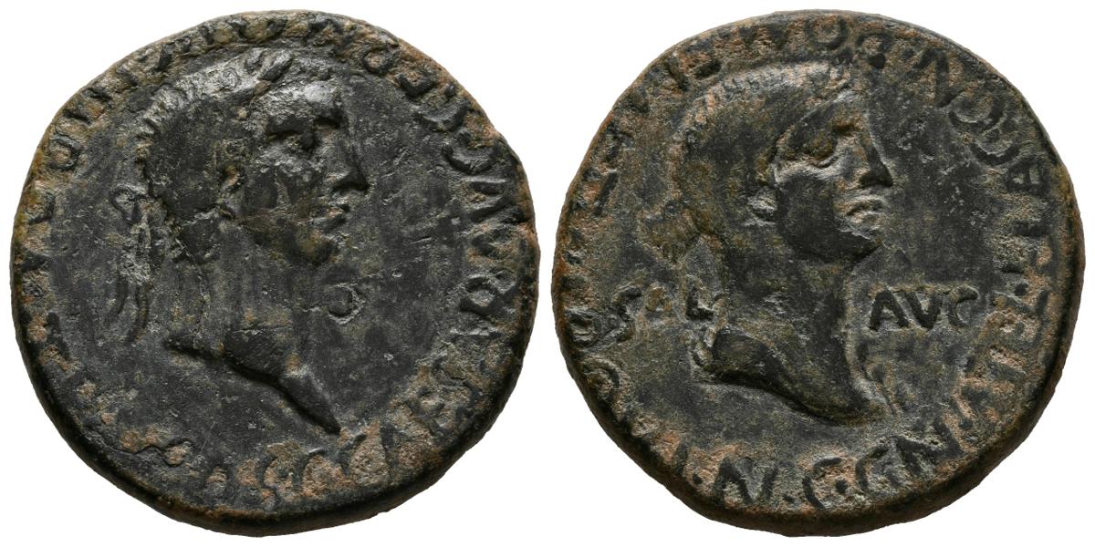 CARTAGONOVA (Cartagena, Murcia). As. (Ae. 13,17g/27mm). 37-41 d.C. (FAB-613). Anv: Cabeza de Calígula laureada a derecha, alrededor leyenda: C CAESAR AVG GERMANIC IMP P M TR P COS. Rev: Cabeza laureada de Cesonia, a los lados: SAL-AVG, alrededor leyenda: CN ATEL FLAC CN POM FLAC II VIR. MBC.