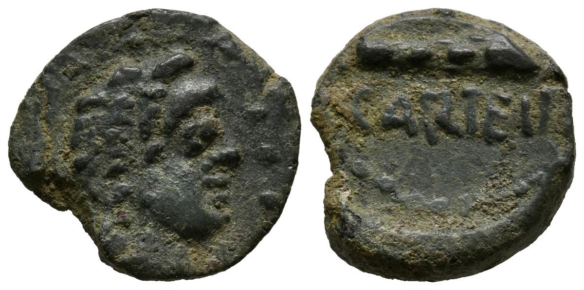 CARTEIA (San Roque, Cádiz). Cuadrante. (Ae. 3,45g/17mm). 80-20 a.C. (FAB-655). Anv: Cabeza masculina a derecha, delante tres puntos. Rev: Clava, debajo leyenda: CARTEIA. MBC+.