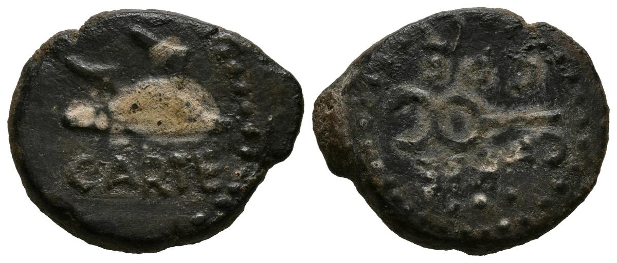 CARTEIA (San Roque, Cádiz). Cuadrante. (Ae. 4,00g/19mm). 80-20 a.C. (FAB-658). Anv: Petaso, debajo leyenda: CARTEIA. Rev: Caduceo, encima leyenda: C P E, debajo leyenda retrógada: CARTEIA, debajo tres puntos. MBC-. Muy raro.