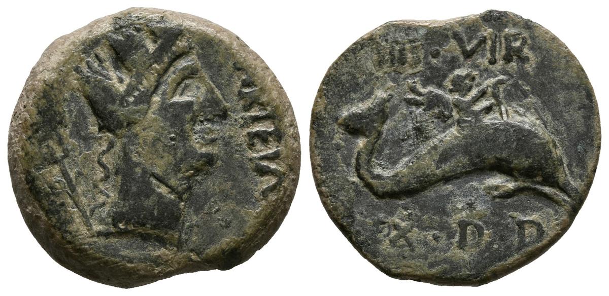 CARTEIA (San Roque, Cádiz). Semis. (Ae. 4,34g/19mm). 27 a.C.-14 d.C. (FAB-670). Anv: Cabeza femenina con corona mural a derecha, delante leyenda: CARTEIA, detrás tridente. Rev: Amorcillo sobre delfín a derecha, alrededor leyenda: IIII VIR D D. MBC-.