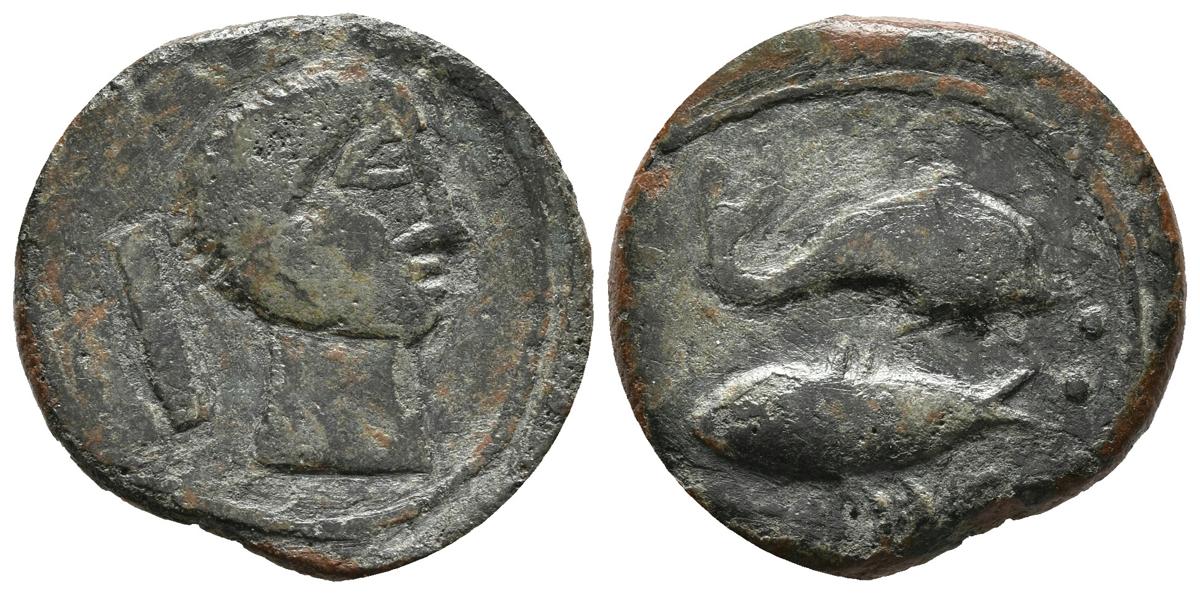 ABDERA (Almería). Semis. (Ae. 5,16g/20mm). 150-50 a.C. (FAB-14). Anv: Cabeza masculina a derecha, detrás clava. Rev: Delfín a derecha, atún a izquierda, debajo leyenda púnica, delante dos puntos. MBC-.