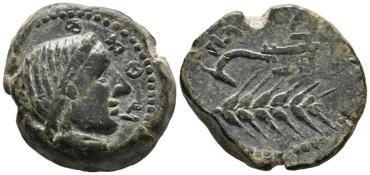 ABRA (Zona de Porcuna, Jaén). As. (Ae. 24,83g/32mm). 120-20 a.C. (FAB-28). Anv: Cabeza femenina a derecha, alrededor leyenda ibérica: OTuBoTuKi. Rev: Arado a izquierda, espiga a derecha, encima leyenda ibérica. MBC.
