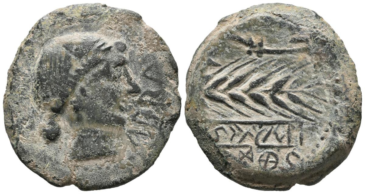 ABRA (Zona de Porcuna, Jaén). As. (Ae. 17,37g/32mm). 120-20 a.C. (FAB-30). Anv: Cabeza femenina a derecha, delante leyenda: ABRA. Rev: Arado a izquierda, debajo espiga a derecha, leyenda ibérica en dos líneas: TaKiSNiS/TuBoTuKi. MBC-.