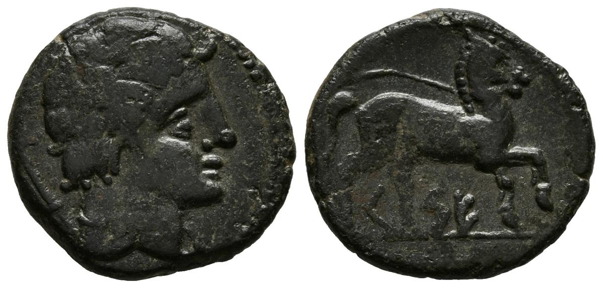 CESE (Tarragona). Semis. (Ae. 3,78g/19mm). 120-20 a.C. (FAB-2306). Anv: Cabeza masculina a derecha, detrás caduceo. Rev: Caballo a derecha al trote, entre sus patas leyenda ibérica: CeSE. MBC-.