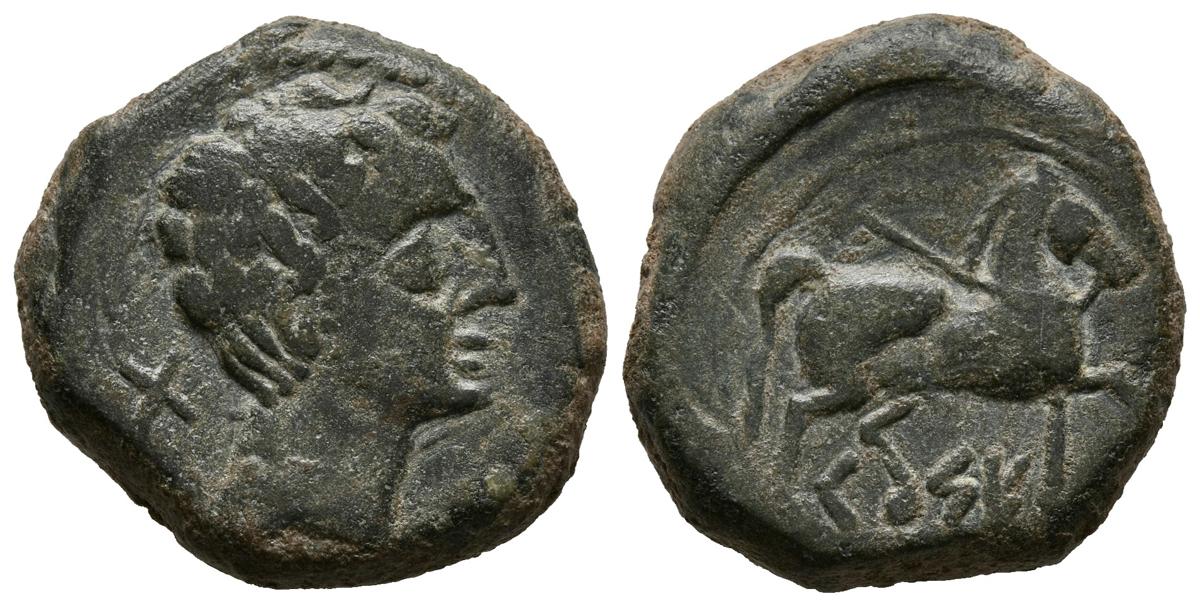 CESE (Tarragona). Semis. (Ae. 8,32g/21mm). 120-20 a.C. (FAB-2316). Anv: Cabeza masculina a derecha, detrás letra Ta. Rev: Caballo a derecha al trote, entre sus patas leyenda ibérica: CeSE. MBC-.