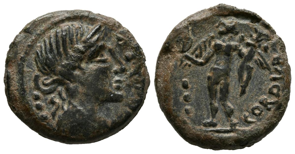 COLONIA PATRICIA (Córdoba). Semis. (Ae. 5,99g/20m). 50 a.C. (FAB-1984). Anv: Cabeza de Venus a derecha, detrás tres puntos, delante leyenda: CN IVLI L F Q. Rev: Cupido con cornucopia y antorcha a izquierda, delante tres puntos, detrás leyenda: CORDVBA. EBC-.