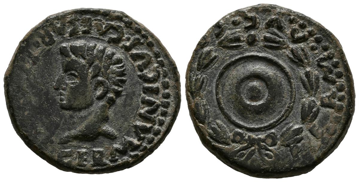 COLONIA ROMULA (Sevilla). Semis. (Ae. 7,43g/24mm). 14-36 d.C. (FAB-2017). Anv: Cabeza de Germánico a izquierda, alrededor leyenda: GERMANICVS CAESAR TI AVG F. Rev: Rodela dentro de láurea, alrededor leyenda: PERM AVG COL ROM. MBC+.