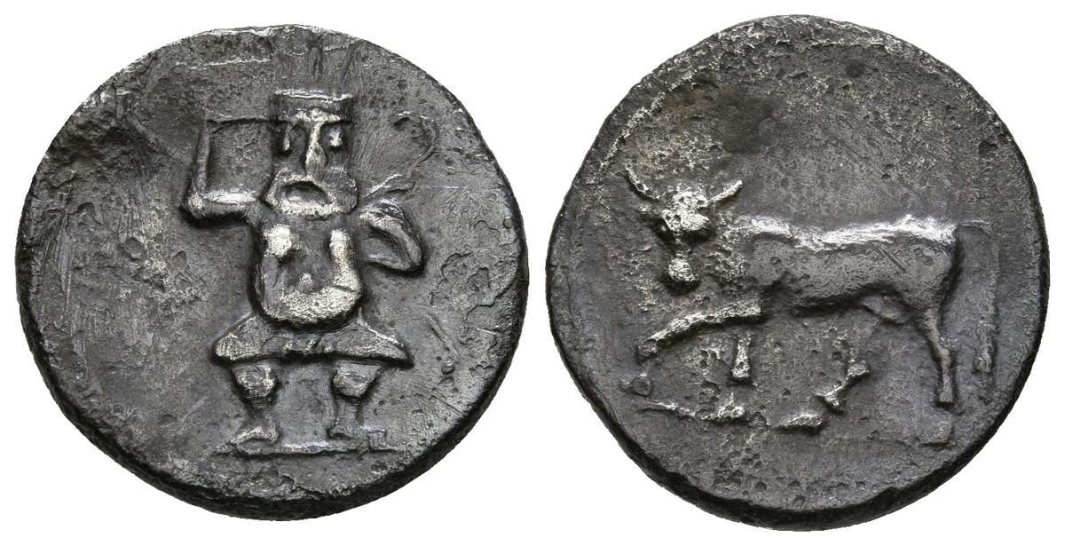 EBUSUS (Ibiza). Hemidracma. (Ar. 2,40g/16mm). 200-100 a.C. (FAB-915). Anv: Bes con faldellín sosteniendo martillo y serpiente. Rev: Toro a izquierda. MBC. Pátina oscura. Escaso.