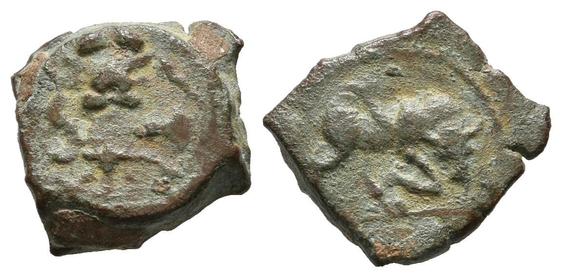 EBUSUS (Ibiza). 1/8 Calco. (Ae. 1,30g/11mm). 200-100 a.C. (FAB-924). Anv: Bes con faldellín sosteniendo martillo y serpiente. Rev: Toro embistiendo a derecha. MBC+.