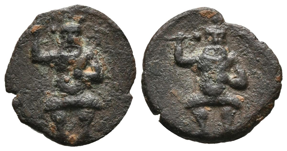 EBUSUS (Ibiza). 1/4 Calco. (Ae. 1,50g/15mm). 200-100 a.C. (FAB-928). Anv: Bes con martillo y serpiente. Rev: Bes con martillo y serpiente. MBC-.