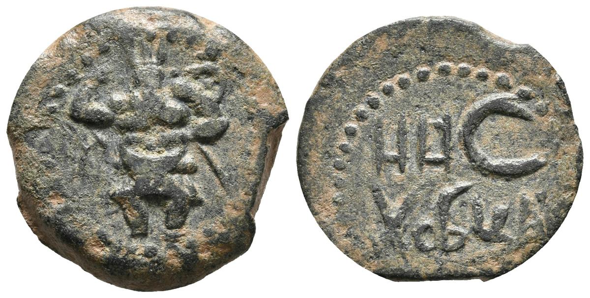 EBUSUS (Ibiza). Semis. (Ae. 6,72g/21mm). 20 a.C. (¿FAB-946?). Anv: Bes con martillo y serpiente, a su izquierda letra púnica ¿Alef?. Rev: Leyenda púnica. MBC.