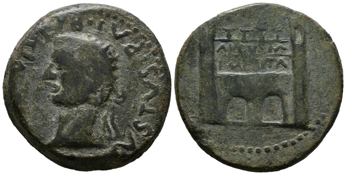 EMERITA AUGUSTA (Mérida, Badajoz). Dupondio. (Ae. 23,02g/32mm). 14-36 d.C. (FAB-1029). Anv: Cabeza radiada de Augusto a izquierda, alrededor leyenda: AVGVSTVS PAT PATRIA. Rev: Puerta con inscripción: AVGVSTA EMERITA. BC.