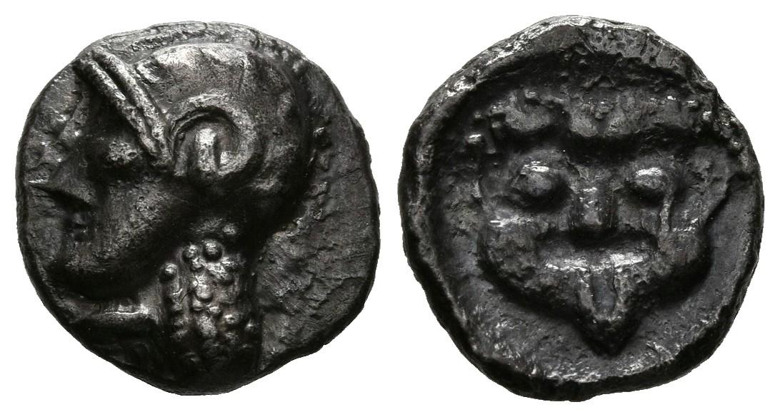 EMPORION (Ampurias, Gerona). Obolo. (Ar. 1,01g/10mm). Siglo V a.C. (ca.). (ACIP 41). Anv: Cabeza de ¿Atenea? con casco a izquierda. Rev: Cabeza de Gorgona de frente. EBC-. Extraordinariamente raro y precioso ejemplar, similar al lote 159 de la subasta 27/02/2002 por Aureo & Calicó, que lo catalogó como pieza inédita, adjudicado por 1700€.