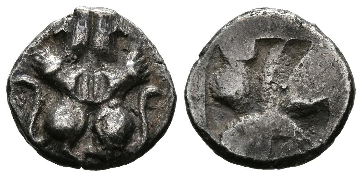 EMPORION (Ampurias, Gerona). Obolo. (Ar. 0,88g/10mm). Siglo V a.C. (ca.). Anv: Dos esfinges rampantes bifrontes. Rev: Incuso irregular. La esfinge es una representación típica de la polis Abdera en Tracia y de las polis Chios y Teos en Jonia. Extraordinariamente raro y precioso ejemplar, similiar al lote 163 de la subasta 27/02/2002 por Aureo & Calicó, que lo catalogó como pieza inédita, adjudicado por 1800€