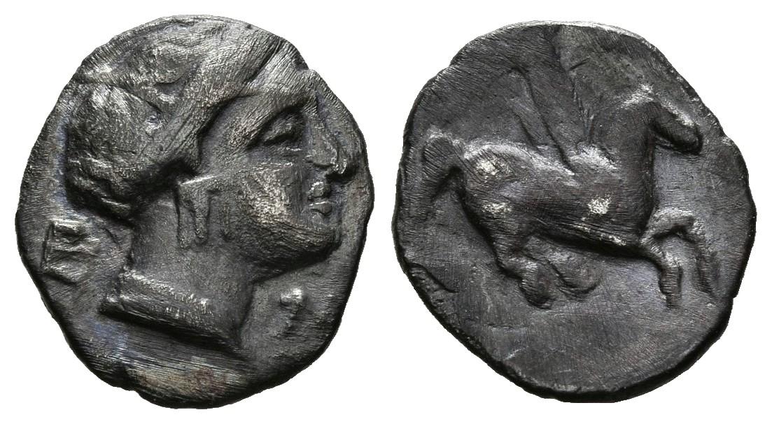 EMPORION (Ampurias, Gerona). Tritartemorion. (Ar. 0,54g/10mm). 200-110 a.C. (ACIP 180). Anv: Cabeza femenina a derecha, entre E-M. Rev: Pegaso a derecha. MBC. Escaso.
