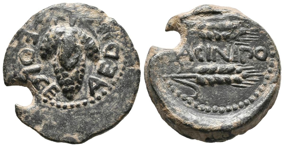 ACINIPO (Ronda, Málaga). As. (Ae. 7,24g/23mm). 100-50 a.C. (FAB-59). Anv: Racimo de uvas, encima estrella, alrededor leyenda: L FOLCE AEDILE. Rev: Dos espigas a derecha, entre ellas leyenda: ACINIPO. MBC.