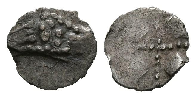 EMPORION (Ampurias, Gerona). Obolo. (Ar. 0,04g/9mm). Siglo V a.C. (ca.). (Villaronga 44 var). Anv: Cabeza de carnero a izquierda. Rev: Cruz de puntos dentro de cuadrado incuso. MBC+. Escaso.
