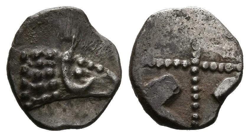 EMPORION (Ampurias, Gerona). Obolo. (Ar. 0,34g/7mm). Siglo V a.C. (ca.). (Villaronga 59 var). Anv: Cabeza de carnero a derecha. Rev: Cruz de puntos incusa. MBC+. Escaso.
