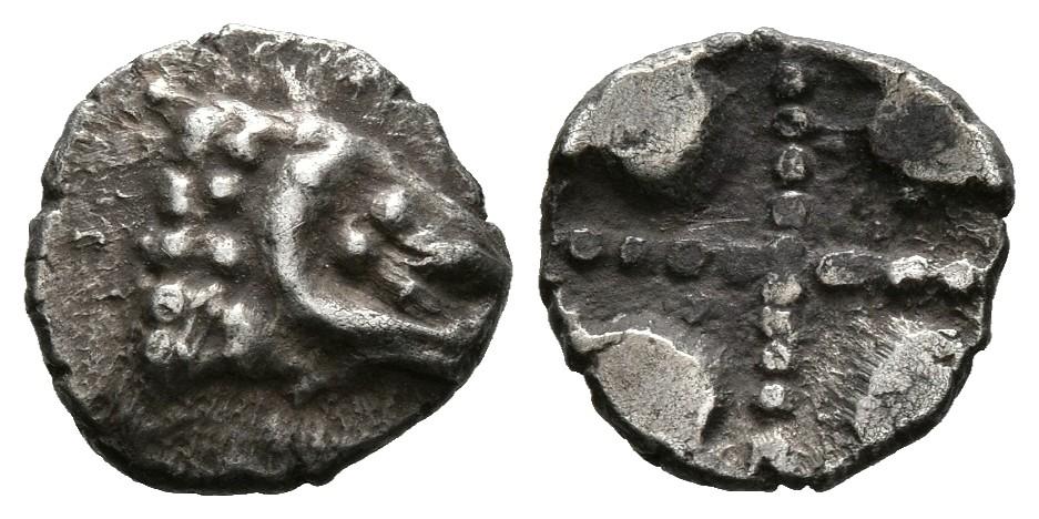 EMPORION (Ampurias, Gerona). Obolo. (Ar. 0,45g/8mm). Siglo V a.C. (ca.). (Villaronga 64). Anv: Cabeza de carnero a derecha. Rev: Cruz de puntos incusa. MBC+. Escaso.