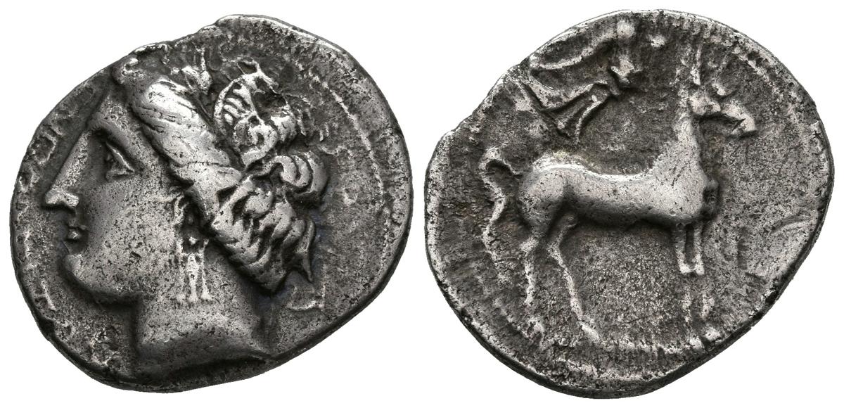 EMPORION (Ampurias, Gerona). Dracma. (Ar. 4,70g/21mm). 220-200 a.C. (FAB-1098). Anv: Cabeza femenina a izquierda, delante leyenda griega. Rev: Caballo parado a derecha, encima Victoria a derecha. MBC. Muy raro.