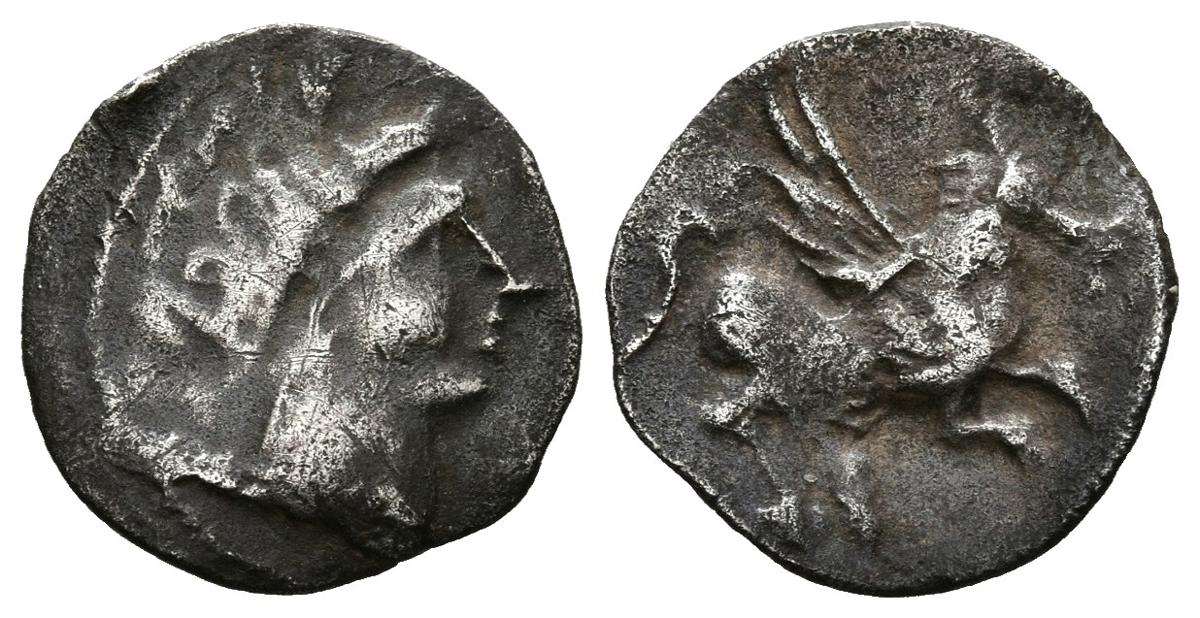 EMPORION (Ampurias, Gerona). Tritartemorion. (Ar. 0,33g/11mm). 200-110 a.C. (FAB-1132). Anv: Cabeza femenina a derecha. Rev: Pegaso a derecha. MBC.