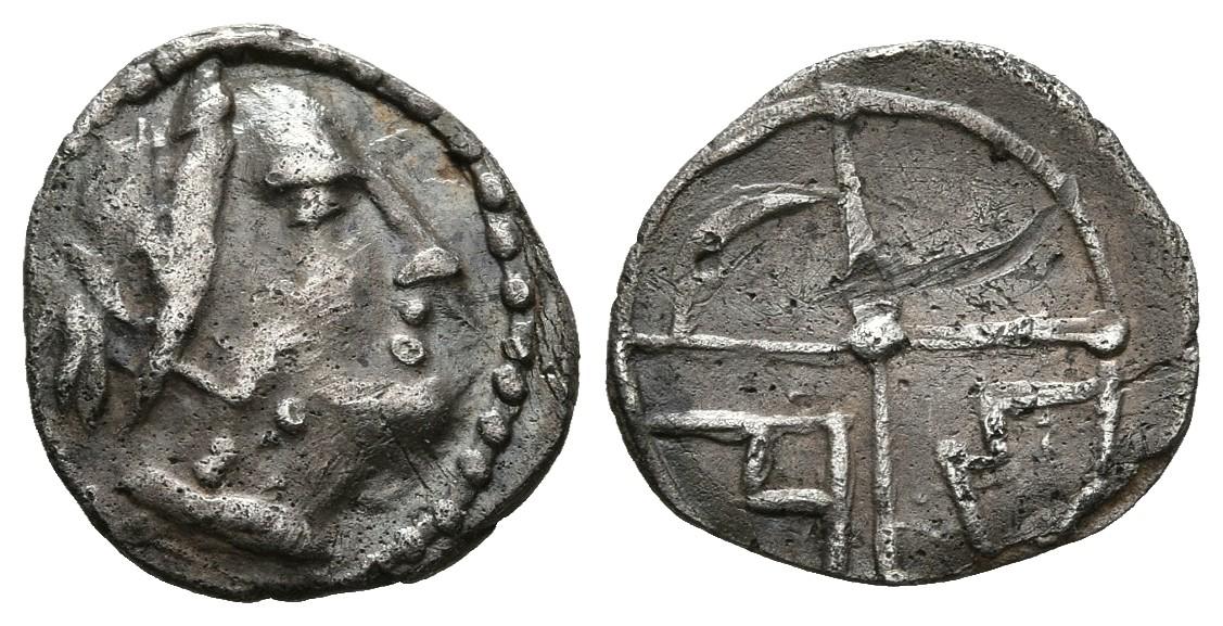 DIVISORES DE IMITACION DE MASSALIA. Trietartemorion. (Ar. 0,41g/10mm). 200-110 a.C. (FAB-1184 var). Anv: Cabeza femenina a derecha. Rev: Rueda de cuatro radios, dentro de ellos creceinte, A y M. MBC.